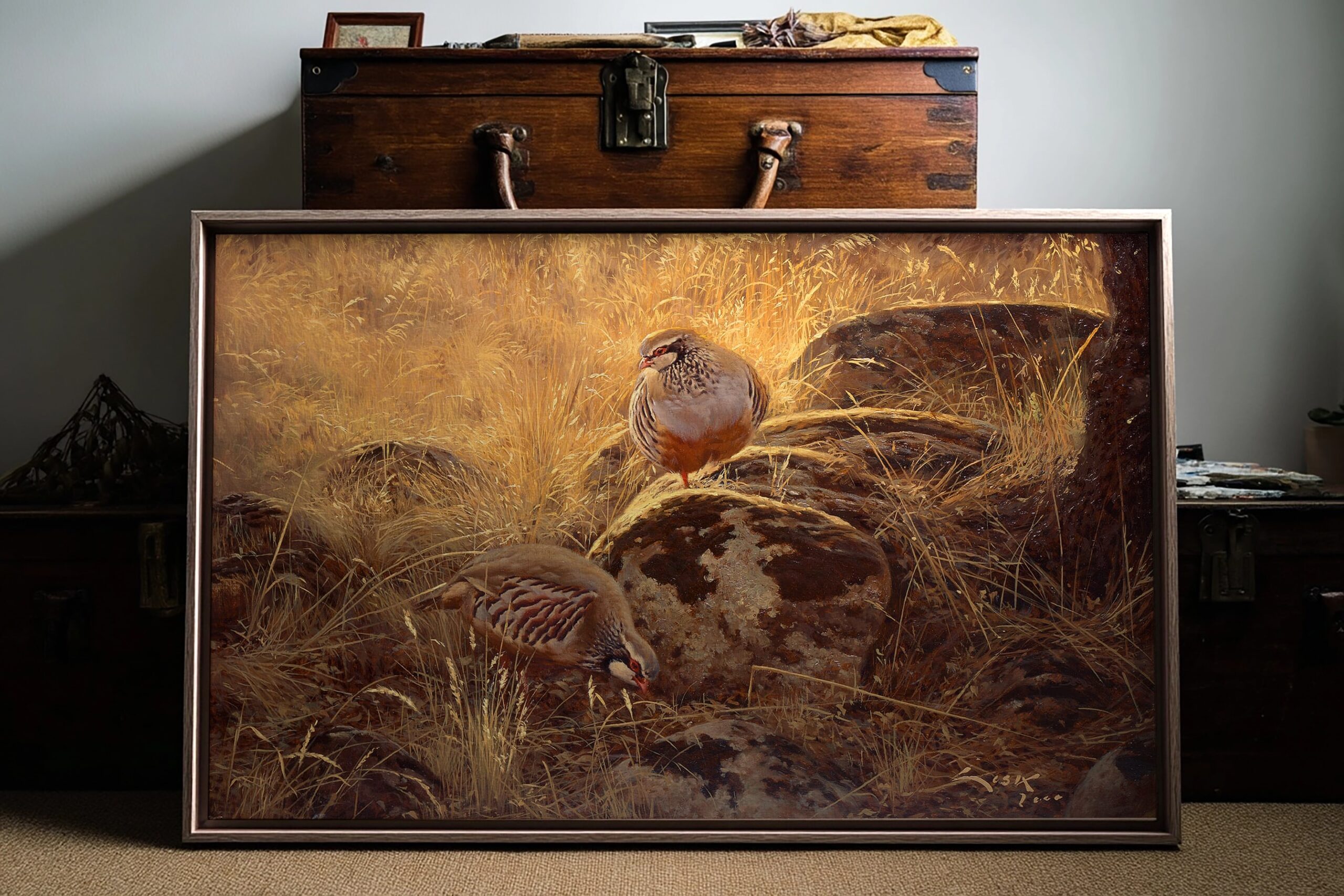 Una pareja de Perdices Rojas semilleando al atardecer. Este cuadro es un óleo sobre tabla. Oleo sobre tablex. Manuel Sosa © 1998