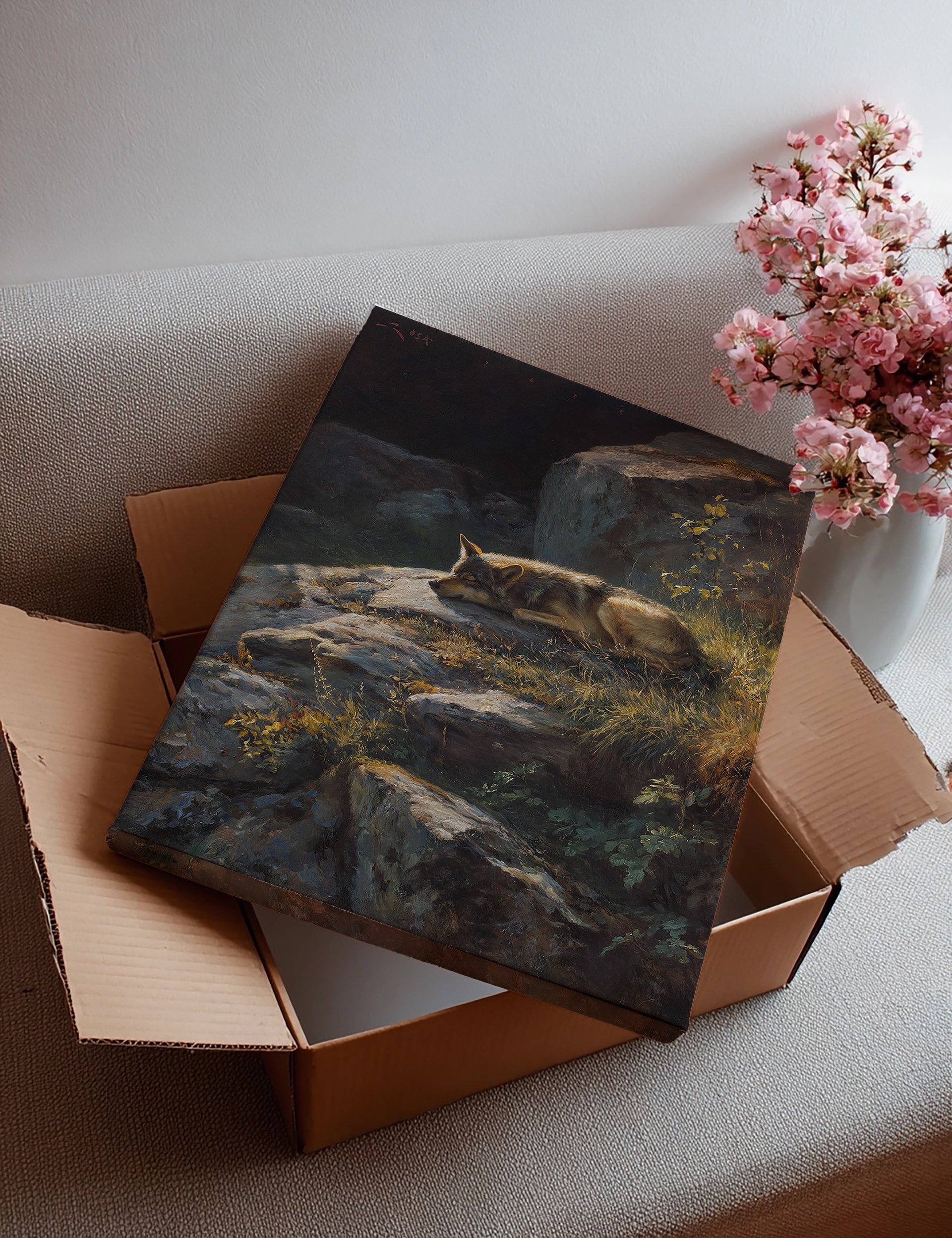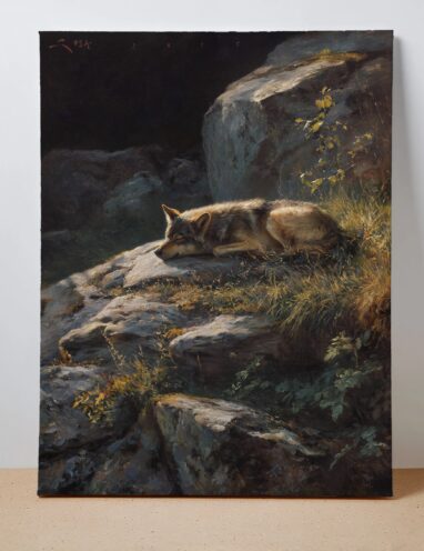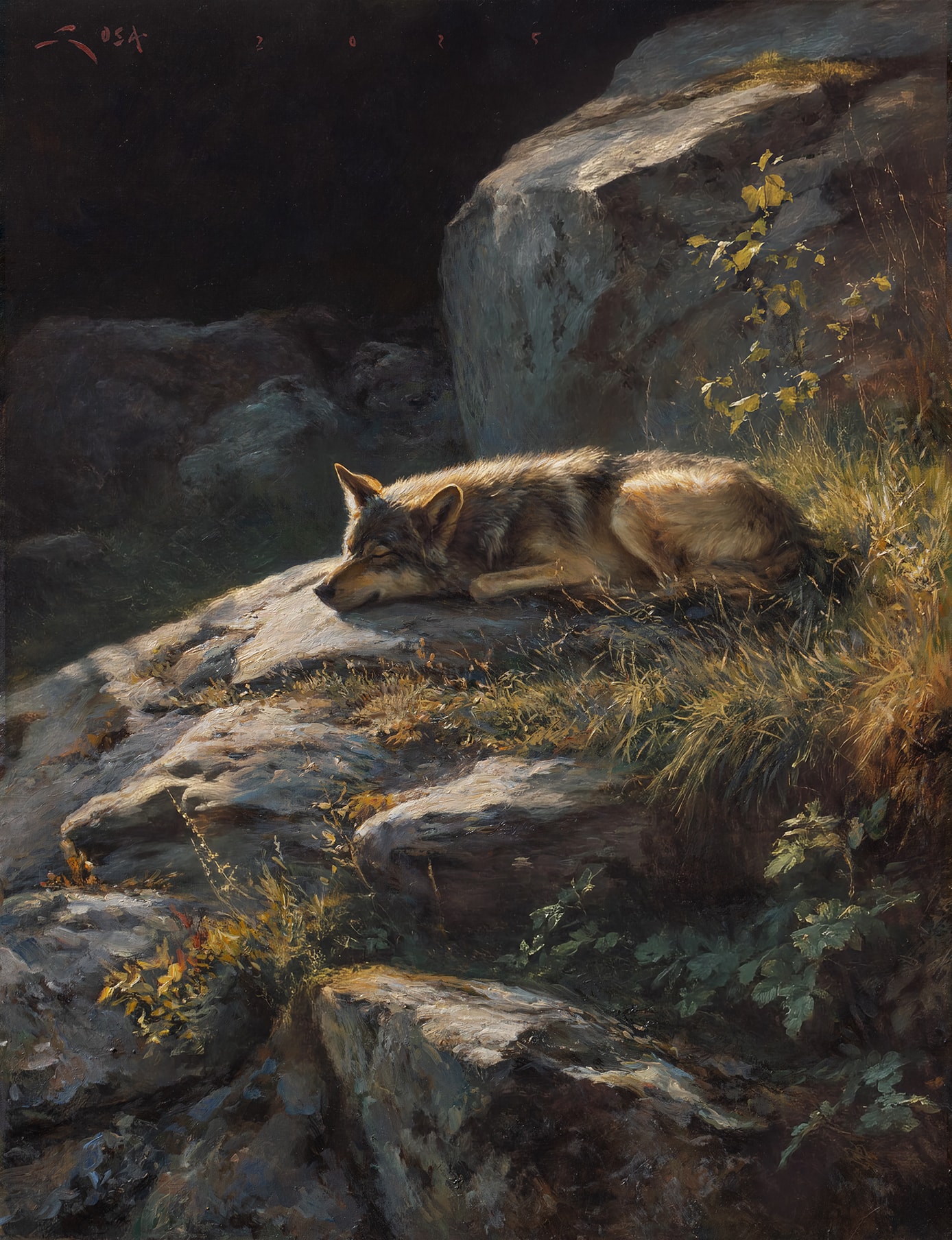 An Iberian wolf dreams in the deepest recesses of the Sierra de la Demanda. It sleeps peacefully, but its brothers to the north of the Duero are once again the prey of farmers and hunters because of an amendment approved in Congress, after the great historic achievement of banning their hunting in 2021. Because there are too many of them, they argue, some 300 herds compared to 48 million Spaniards... This painting is my way of giving a voice to those who have none. Oil on canvas © Manuel Sosa 2025