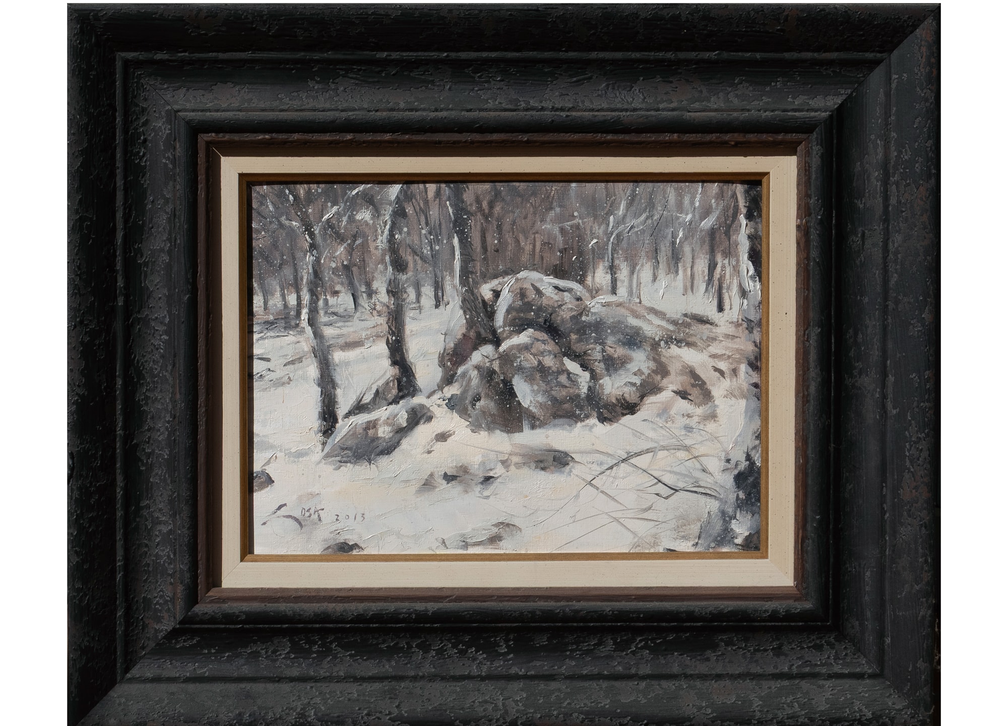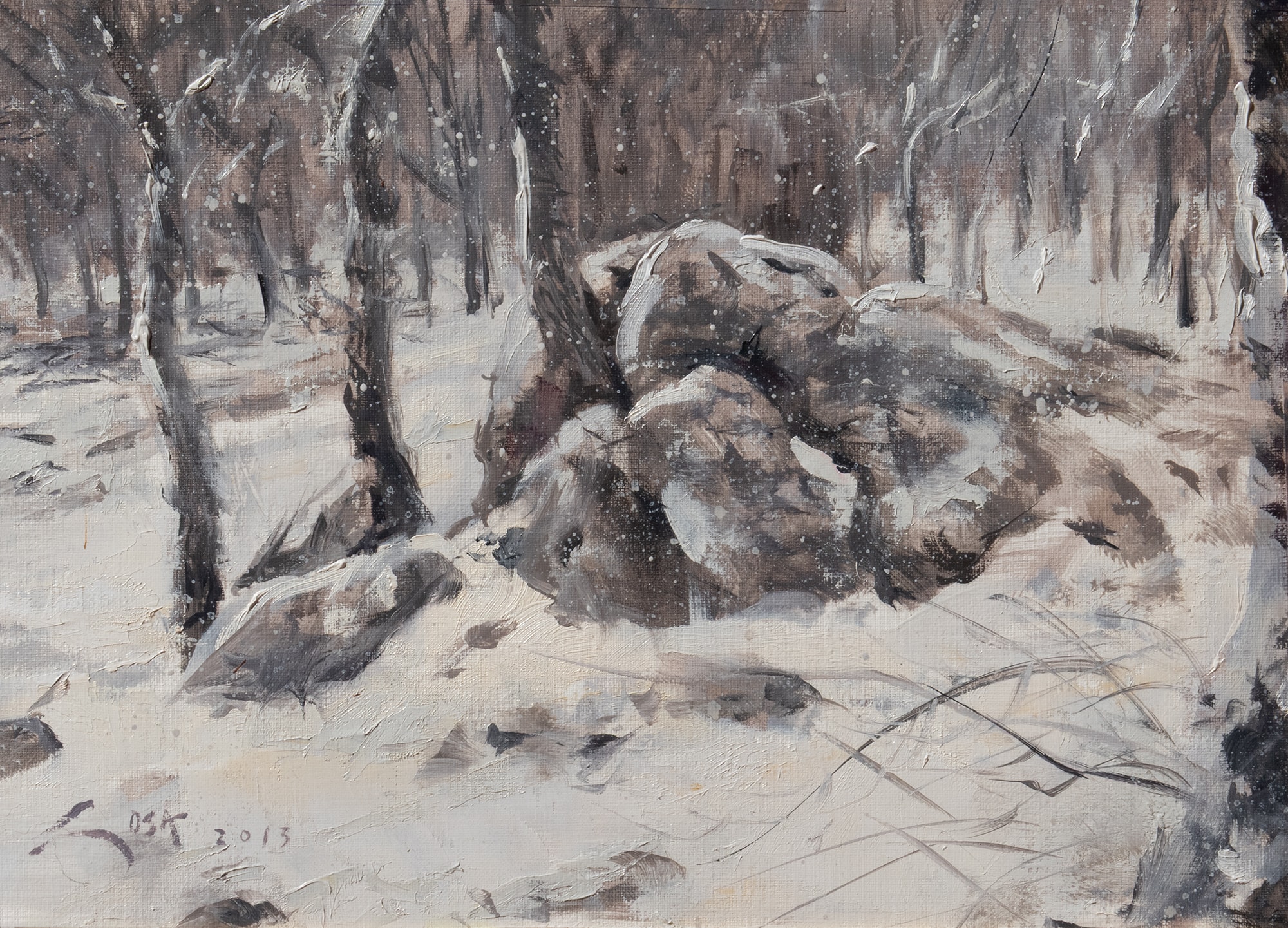 Une grande partie de mes peintures sont basées sur de petites études peintes d'après nature, comme cette forêt de chênes enneigés dans la Sierra de Guadarrama - Moralzarzal. Peinture à l'huile - Manuel Sosa © 2013