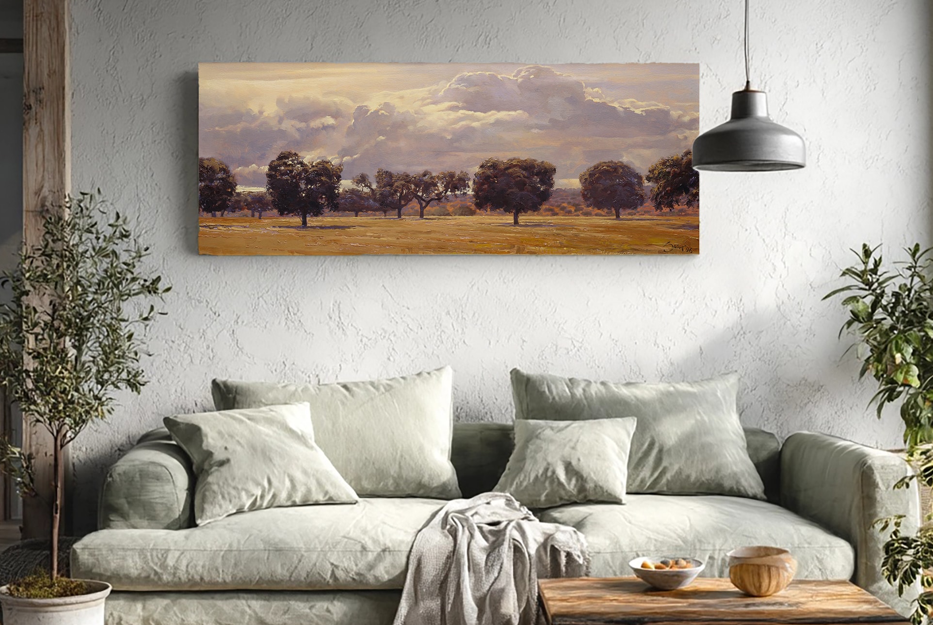 Infinitas azinheiras cheias de vida esperam o viajante que vagueia por estas terras. Como as notas de um pentagrama, as copas das árvores repetem-se no céu para sugerir o ritmo da composição. Pintura a óleo sobre painel 80 x 31 cms. © Manuel Sosa 1996